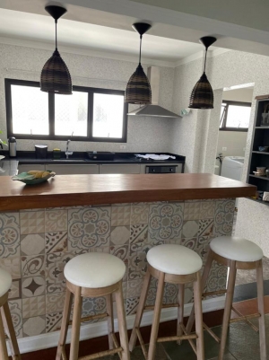 Cama, sala de jantar completa, armários planejados cozinha e suítes, canto de leitura.